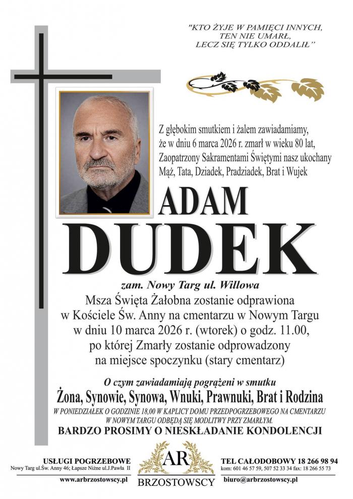 Uroczystości pogrzebowe Adama Dudka odbędą się we wtorek 10 marca 2026 roku o godzinie 11.00 w kościele św. Anny na cmentarzu w Nowym Targu. Po Mszy Świętej zmarły zostanie odprowadzony na miejsce wiecznego spoczynku.