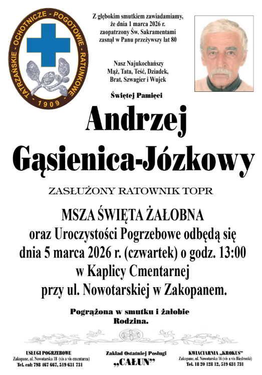 Ratownik związany z Tatrzańskim Ochotniczym Pogotowiem Ratunkowym zmarł w niedzielę 1 marca 2026 roku w wieku 80 lat.