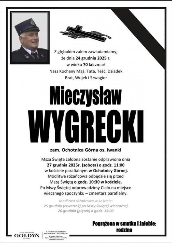 „Dzisiaj rano nasz dh Mieczysław Wygrecki odszedł na wieczną służbę dołączając do oddziałów świętego Floriana … Wyrazy współczucia składamy rodzinie i najbliższym. Zarząd OSP Ochotnica Górna”.