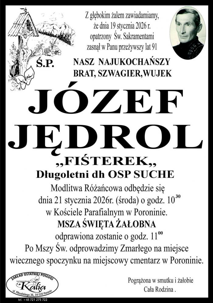 W wieku 91 lat na wieczną służbę odszedł Józef Jędrol z Suchego, znany jako „Fiśterek”. Przez dziesięciolecia był jedną z najbardziej rozpoznawalnych i zasłużonych postaci lokalnego pożarnictwa.