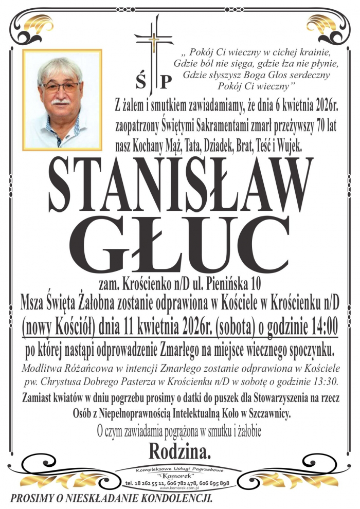 Stanisław Głuc zmarł w poniedziałek 6 kwietnia 2026 roku.
