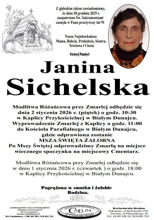 Uroczystości pogrzebowe odbędą się w piątek, 2 stycznia 2026 roku, w Białym Dunajcu. Modlitwa różańcowa przy Zmarłej zostanie odmówiona o godz. 10.30 w Kaplicy Przykościelnej. Następnie o godz. 11.00 nastąpi wyprowadzenie Zmarłej do kościoła parafialnego w Białym Dunajcu, gdzie odprawiona zostanie msza święta żałobna. Po jej zakończeniu Janina Sichelska zostanie odprowadzona na miejscowy cmentarz.