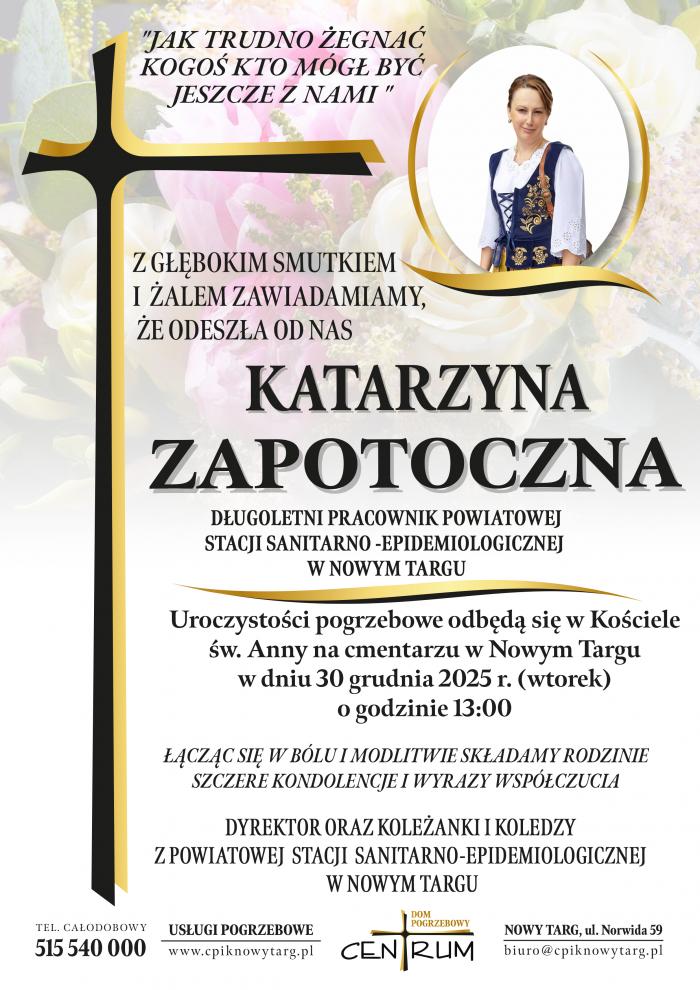 W wieku 39 lat, po ciężkiej chorobie, zmarła Katarzyna Zapotoczna z Nowego Targu. Była długoletnią pracownicą Powiatowej Stacji Sanitarno-Epidemiologicznej w Nowym Targu.