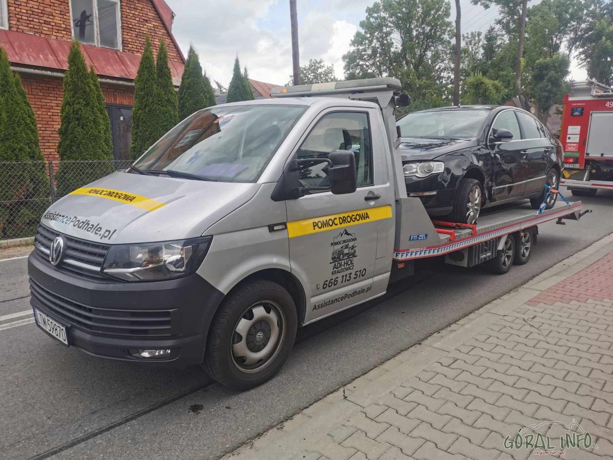 Galeria zdjęć z akcji ratowniczej po zderzeniu dwóch pojazdów. Zespół ZRM udziela pomocy poszkodowanym, a strażacy z JRG Nowy Targ i OSP Bańska Niżna zabezpieczają teren. Fot. Krauzowicz Pomoc Drogowa