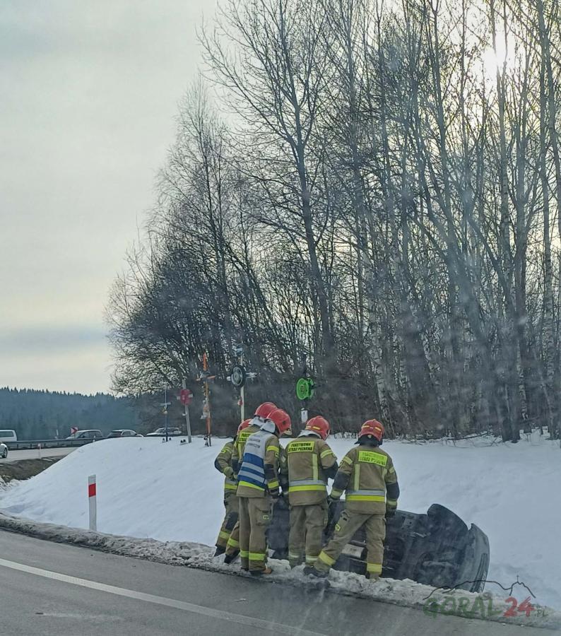Groźnie wyglądające dachowanie na "patelniach" w Chabówce – samochód wypadł z drogi przy krzyżach pamięci
