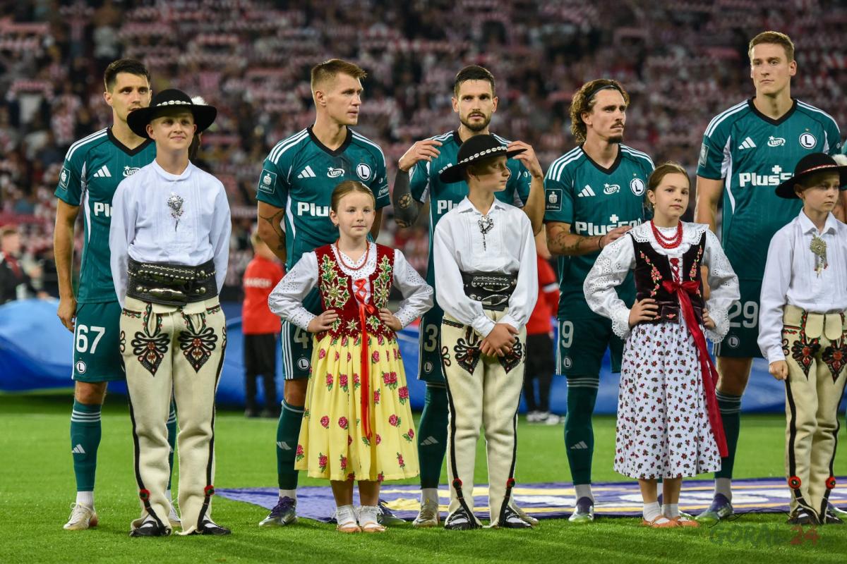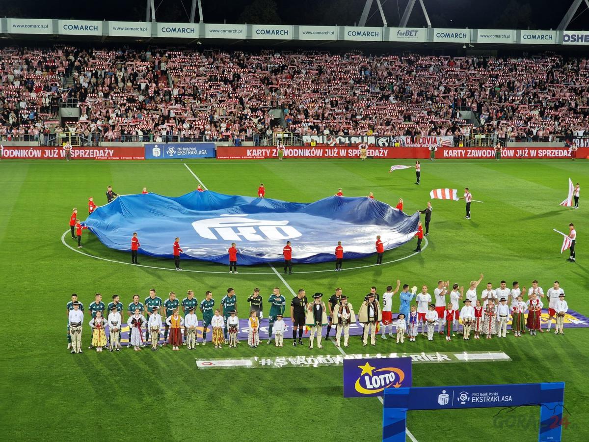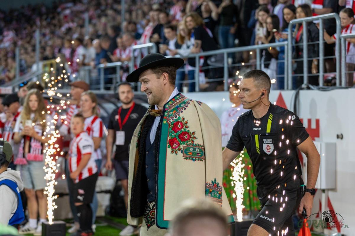 Podczas wyjątkowego wydarzenia na stadionie, w obecności 14 tysięcy kibiców, rozbrzmiał Hymn Kurierów Tatrzańskich. Młodzi górale w tradycyjnym stroju poprowadzili zawodników na boisko, prezentując kulturę Podhala. Atmosferę dopełniała muzyka i śpiew góralski, regionalne przysmaki oraz promocja Podhala. Wydarzenie, które połączyło sport, kulturę i historię, uczciło bohaterów walczących o wolną Polskę. Chwała Tatrzańskim Bohaterom! Fot. Maciej Krzeptowski.