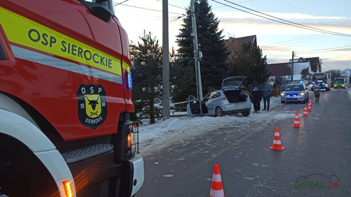 Kolizja w Sierockiem - samochód uderzył w słup telekomunikacyjny