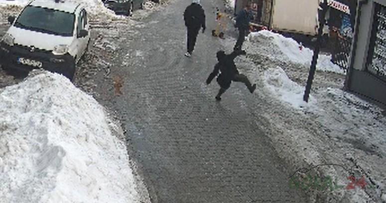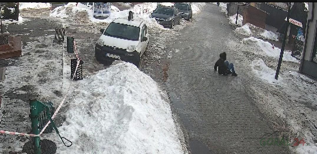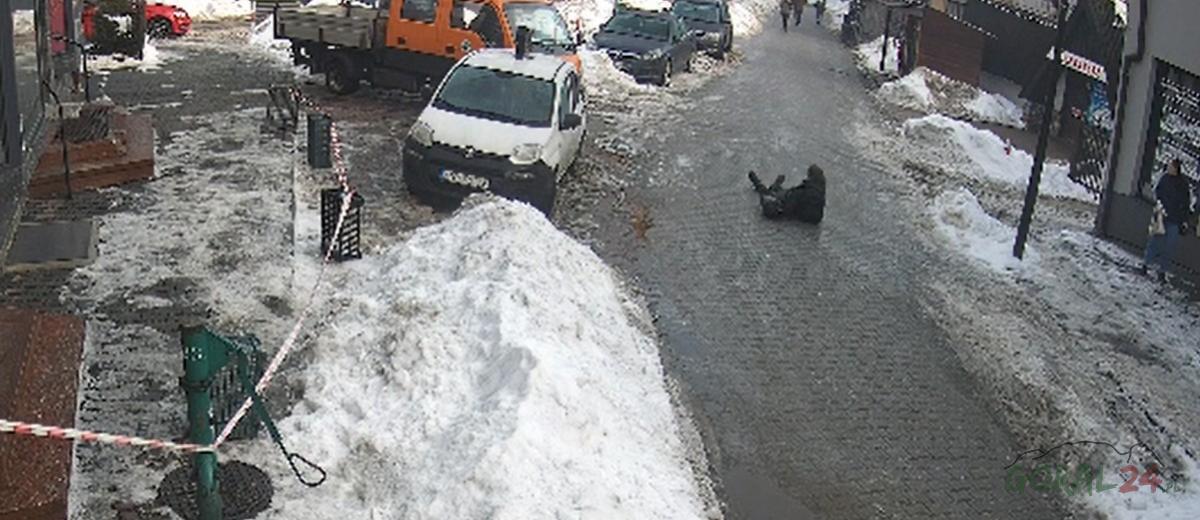 Oblodzona nawierzchnia utrudnia poruszanie się na ulicy Krzywej