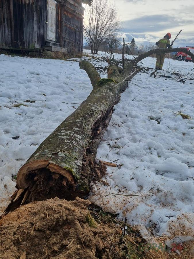 Zdjęcia Poranna akcja strażaków - drzewo pochylone na dom zostało wycięte - fotorelacja