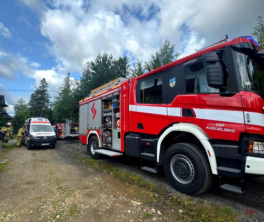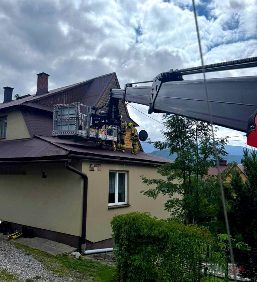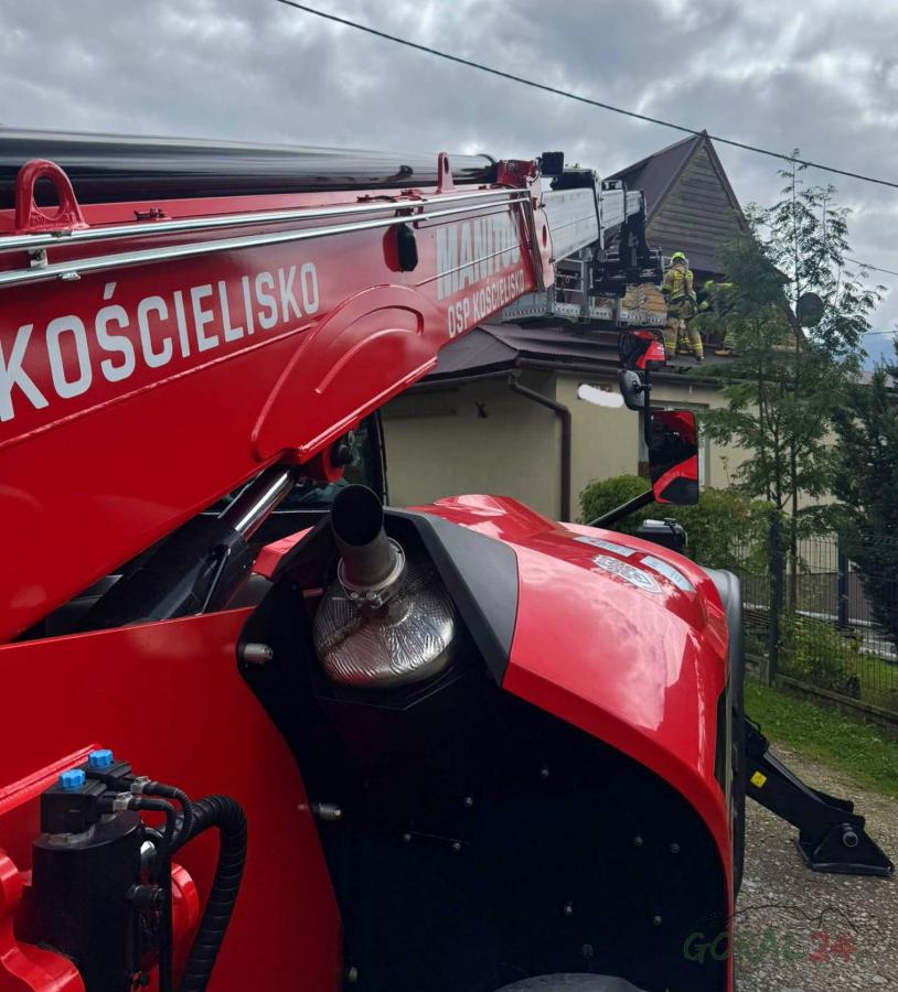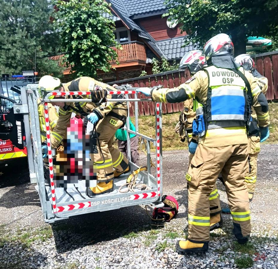 Strażacy z OSP Kościelisko udzielają pomocy zespołowi ratownictwa medycznego, wykorzystując ładowarkę teleskopową do ewakuacji osoby poszkodowanej z piętra budynku.