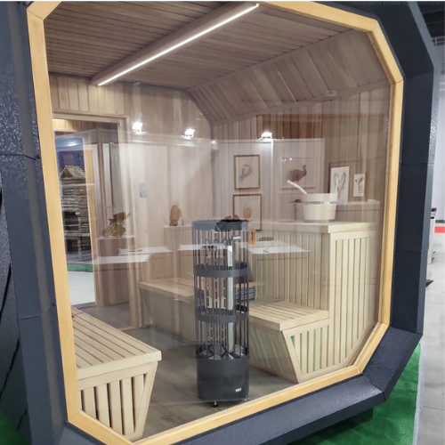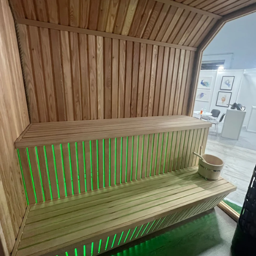 - Wyposażona w piec elektryczny Harvia Legend 9kW z dotykowym sterownikiem oraz oświetlenie LED RGB, sterowane dotykowo – dla pełnego komfortu użytkowania.